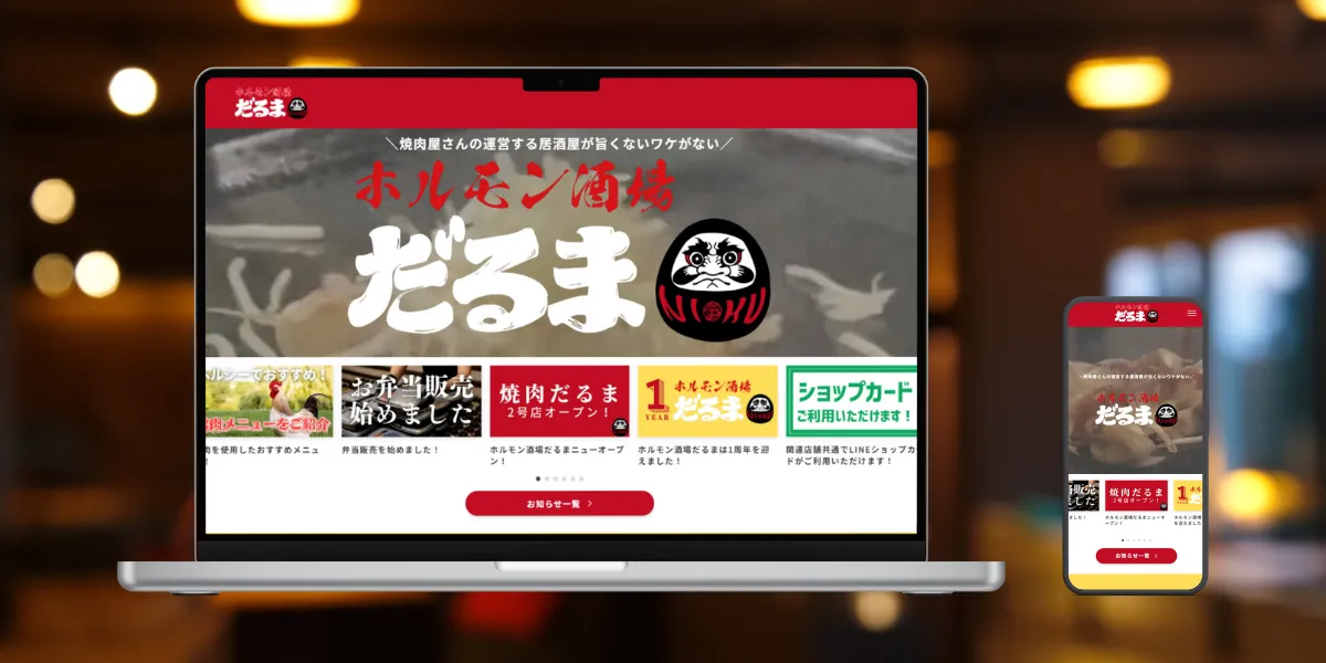 居酒屋の雰囲気を感じられるデザインを取り入れ、写真とメニュー情報を充実させることで集客効果を高めています。